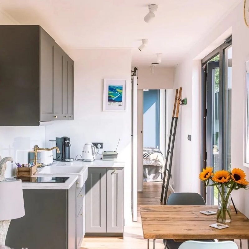 • Mutfak ve Yatak Odası: Mutfaklarımızda birinci sınıf MDF karkas ve lake kaplama kapak kullanılır. Mutfak tezgahı 40 mm kalınlığında massif meşe ağacındandır. 40 cm krom Teka Mutfak evyesi ve batarya kullanılmaktadır. Yatak odası için 160×200 cm ölçülerinde birinci sınıf MDF malzeme ile altı 4 çekmeceli yatak bazası yapılmaktadır.
